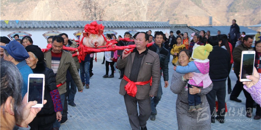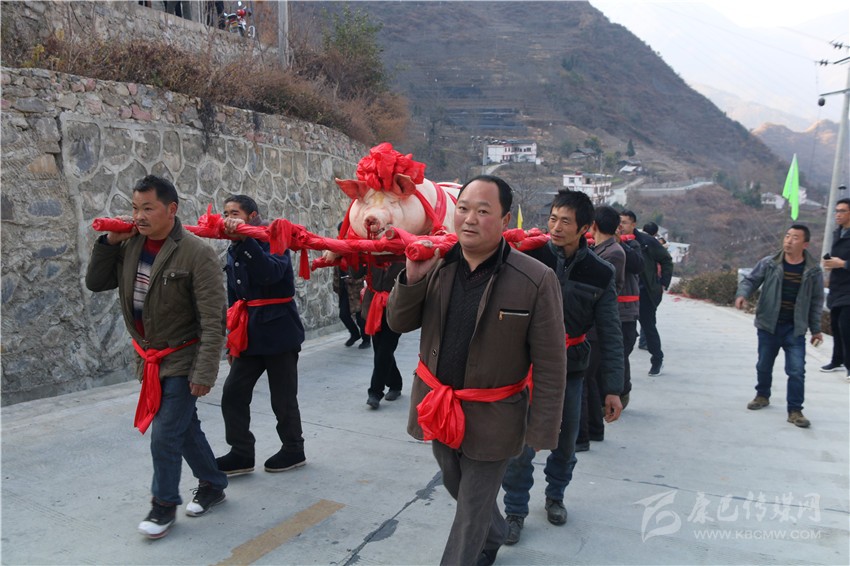5個(gè)村民將年豬抬到秤上。360斤。村民為年豬準(zhǔn)備大紅花。準(zhǔn)備紙錢、香蠟。9點(diǎn)整,殺豬匠開始了他的工作,在眾人齊心協(xié)力下,光溜溜的年豬被打整干凈?!氨S游覀兇鍋砟觑L(fēng)調(diào)雨順、五谷豐登,村民平安健康?!贝逯欣险呔催^天地后,8個(gè)身強(qiáng)力壯的村民站在年豬旁,豎著拇指齊聲說,今年家家戶戶還要養(yǎng)大肥豬。抬著年豬,村里的中老年人簇?fù)碇咴谧钋懊?,唱著悅耳的民謠,大意是歌唱幸福生活的,迎著2018年的第一縷陽光,村民們喜氣洋洋。到村里來的游客蜂擁拍照。