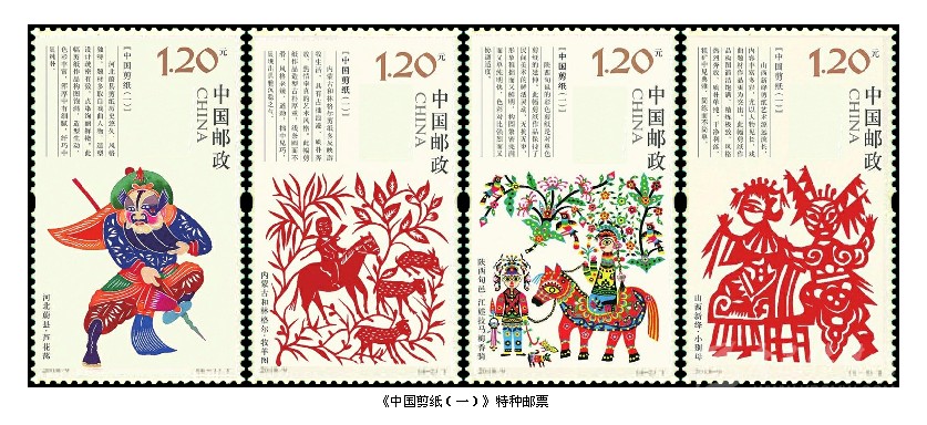 2018年1月24日,中國郵政發(fā)行《中國剪紙(第一組)》特種郵票,全套4枚。這是中國郵政繼1959年1月1日發(fā)行的《剪紙》特種郵票59年后重新發(fā)行的《中國剪紙》系列郵票。全系列郵票計劃發(fā)行4組,每組4枚。這次發(fā)行的第一組4枚郵票入選內(nèi)容分別是被列入第一批國家級非物質(zhì)文化遺產(chǎn)名錄的北方四處剪紙傳承人的作品:第一枚“河北蔚縣·蘆花蕩”,河北蔚縣剪紙歷史悠久,風(fēng)格獨特,題材多取自于人物,造型設(shè)計疏密有致,點染絢麗鮮艷。此幅作品作者王老賞(1890-1951),河北省蔚縣南張莊村人;第二枚“內(nèi)蒙和林格爾·牧羊圖”,內(nèi)蒙古和林格爾剪紙多反映游牧生活,具有古拙浪漫、質(zhì)樸奔放、熱情率真的藝術(shù)風(fēng)格。此幅作品作者張花女 (1903-2004),和林格爾縣董家營鄉(xiāng)曹老八夭村人;第三枚“陜西旬邑·江娃拉馬梅香騎”,陜西旬邑的彩色剪紙具有民間美術(shù)的鮮活靈動,無拘無束,形象稚拙而又鮮明,構(gòu)圖緊密完滿而又單純明快,色彩對比強烈而又協(xié)調(diào)適度。此幅作品作者庫淑蘭(1920-2004),陜西咸陽市旬邑縣張洪鎮(zhèn)赤道鄉(xiāng)富村人;第四枚“山西新絳·小別母”,山西新絳剪紙藝術(shù)源遠流長,內(nèi)容豐富多彩,尤以人物見長,戲曲題材作品更為突出,構(gòu)圖簡潔飽滿、精煉極致,粗獷中見典雅,簡煉而不簡單。此幅作品作者蘇蘭花(1906-1995),山西運城市新絳縣澤掌鎮(zhèn)北蘇村人。