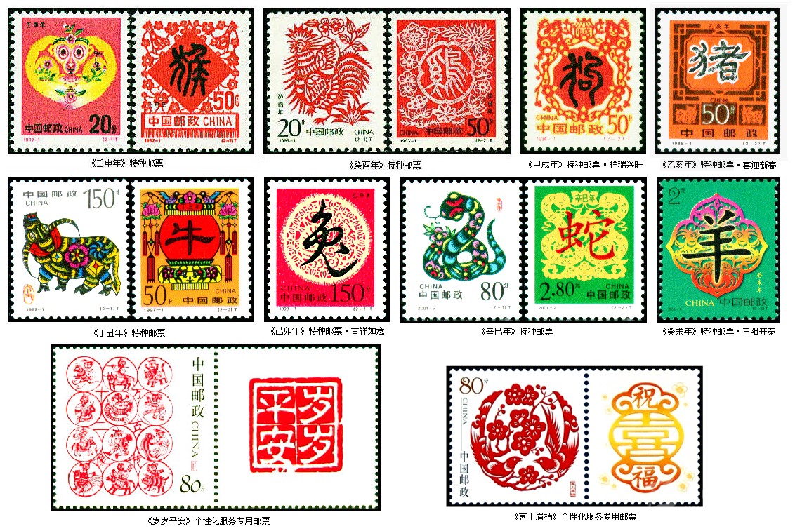 剪紙作為藝術(shù)百花園中的一朵奇葩,在我國郵票圖案設(shè)計中應(yīng)用也非常廣泛。由于傳統(tǒng)的民間剪紙有著濃郁的吉祥喜慶氣氛,因此在我國近些年發(fā)行的生肖郵票中多次出現(xiàn)剪紙藝術(shù)。在第二輪12套24枚生肖郵票中的剪紙圖案分別有1992年《壬申年》的“猴桃獻瑞”和“喜鵲登梅”、1993年《癸酉年》的“雄雞報曉”和“四季吉祥”、1994年《甲戌年》的第二枚“祥瑞興旺”、1995年的《乙亥年》的第二枚“喜迎新春”、1997年的《丁丑年》的“金牛奮蹄”和“牛耕年豐”、1999年《己卯年》的第二枚“吉祥如意”、 2001年《辛巳年》的“祥蛇祝?!焙汀跋檫\普照”以及2003年的《癸未年》第二枚“三陽開泰”等。這些郵票中剪紙圖案有的直接取材于民間,有的則是在原作基礎(chǔ)上再創(chuàng)作。如“雄雞報曉”一枚,圖案選用的是河北省獻縣本齋鄉(xiāng)鄧家莊蔡蘭英老人的剪紙“百雞圖”中的一幅,而“金牛奮蹄”一枚,圖案是根據(jù)山東高密民間藝人齊秀花的剪紙“媳婦騎?!痹偌庸?chuàng)作而成的。在我國發(fā)行的祝福系列個性化服務(wù)專用郵票中也有吉祥喜慶的剪紙圖案,即2005年11月6日的《歲歲平安》和2005年11月11日的《喜上眉梢》等。