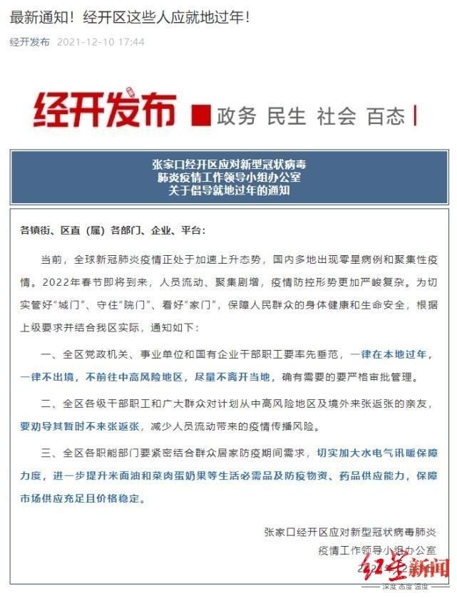 12月9日,河北張家口經(jīng)開區(qū)也發(fā)出通知:全區(qū)黨政機(jī)關(guān)職工等就地過年。通知中倡導(dǎo):全區(qū)黨政機(jī)關(guān)、事業(yè)單位和國(guó)有企業(yè)干部職工要率先垂范,一律在本地過年,一律不出境,不前往中高風(fēng)險(xiǎn)地區(qū),盡量不離開當(dāng)?shù)兀_有需要的要嚴(yán)格審批管理。