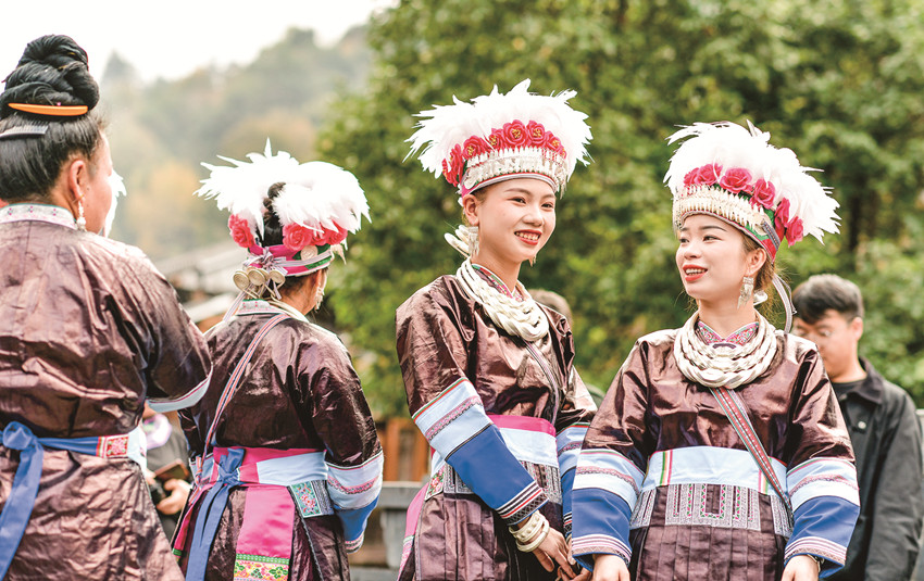 在貴州省黎平縣肇興侗寨,侗族群眾身穿節(jié)日盛裝參加侗年活動(dòng)。